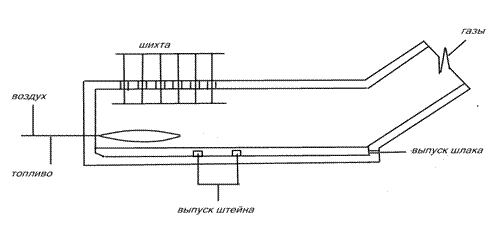 | Цель работы: определить степень десульфуризации при плавке огарка заданного состава; по степени десульфуризации рассчитать количество и состав штейна, который получится при плавке. 1 Теоретическое введение Плавку на штейн применяют для переработки сульфидных медных и никелевых концентратов и руд. Эту плавку можно проводить в нейтральной ( отражательная плавка) или в окислительной (автогенные плавки) атмосфере. Отражательна я плавка сохраняет свое ведущее положение в металлургии. В настоящее время доля меди, полученная с ее использованием, составляет 40-50%. Сущность процесса заключается в том, что нагрев и расплавление шихты происходят за счет тепла от сжигания топлива в газовом пространстве над ванной печи.(рис. 1)