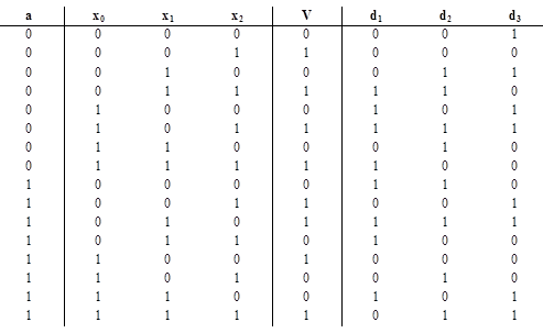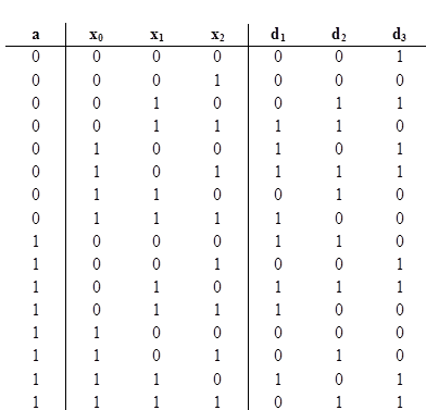 3.3 Минимизация функций переходов автомата Используя кодированные состояния, строится таблица истинности для переходов автомата. Отсутствующие переходы для не существующих кодированных состояний обозначаются *. Таблица 3.3 Таблица истинности для переходов автомата