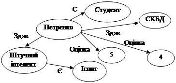 | Семантичні мережі ( реферат) 1. Визначення та класифікація семантичних мереж Семантичні мережі (СМ) – спосіб графічного подання знань, з наголосом на зв’язках між різними інформаційними одиницями. Інформація про певне поняття формується навколо відповідного вузла. Семантичну мережу можна уявити у вигляді графу, вершини якого визначають об’єкти предметної області, а дуги відповідають зв’язкам між ними. Формально сем. мережа визначається як набір < І, С1 , С2 , … Сn , Г > де І – множина інформаційних одиниць, С1 , С2 , .. Сn – типи зв’язків між інформаційними одиницями, Г – відображення, що задає зв’язки між ін форм. одиницями. Історично першою моделлю сем. мережі була модель Квілліана. Прикл. Твердження „Студент Петренко отримав 5 на іспиті зі штучного інтелекту ” можна зобразити такою сем. мережею