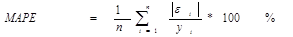 Якщо MAPE<10% - існує висока точність прогнозу; 10%< MAPE<20% - добра точність; 20%< MAPE<50% - задовільна точність; MAPE>50% - незадовільна точність. 5) Середня процентна помилка MPE: