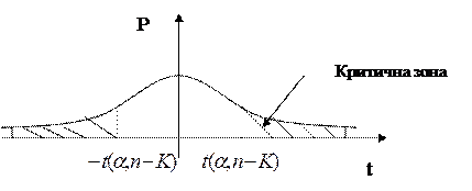 де R – вибірковий коефіцієнт кореляції. КРОК 4. За таблицями t-розподілу Ст’юдента знаходиться критичне значення функції розподілу КРОК 5. Розрахункове значення t-статистики порівнюється з табличним. Знаходиться критична зона (рис. 2.1). КРОК 6. Якщо розрахункове значення t-статистики потрапляє в критичну зону, то