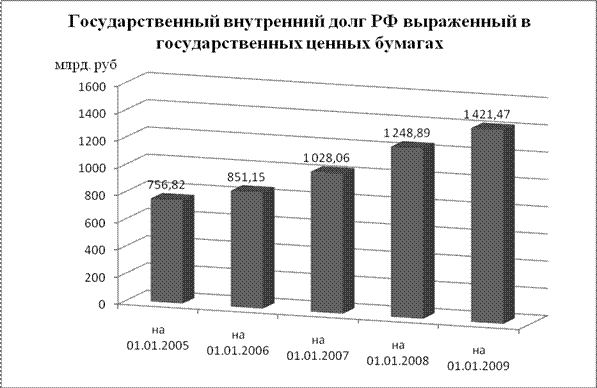 Доля государственного внутреннего долга, выраженного в государственных ценных бумагах, в объеме государственного внутреннего долга, на 1 января 2009 года, по сравнению с 1 января 2008 года, снизилась на 1,2 процента и составила 94,8 %. Значительную долю в государственном внутреннем долге, выраженном в государственных ценных бумагах, на 1 января 2009 года составляли обязательства по ОФЗ-АД – 62,1 % (на 1 января 2008 года – 64,7 %),которые относятся к долгосрочному сегменту рынка государственных ценных бумаг. В рамках долговой политики по удлинению сроков внутренних заимствований в 2008 году основной объем осуществленных заимствований на внутреннем рынке носил среднесрочный и долгосрочный характер. За 2008 год объем внутренних среднесрочных долговых обязательств увеличился на 32 115,1 млн. рублей, или на 14,4 %, и составил на 1 января 2009 года 254 515,0 млн. рублей, объем долгосрочных долговых обязательств увеличился на 140 475,3 млн. рублей, или на 13,8 %, и составил на 1 января 2009 года 1 156 923,7 млн. рублей. Увеличение в структуре государственного внутреннего долга объема среднесрочных и долгосрочных обязательств, свидетельствует о качественном улучшении его структуры. Объем рыночного долга в 2008 году увеличился на 96,6 млрд. рублей, или на 9,2 %, и составил на 1 января 2009 года 1 144,0 млрд. рублей, а его доля в объеме государственного внутреннего долга, выраженного в государственных ценных бумагах Российской Федерации, снизилась до 80,5 % (на 1 января 2008 года - 83,9 %). Дюрация[1] рыночногопортфеля государственных ценных бумаг снизилась с 5,8 лет на начало 2008 года до 5,4 лет на начало 2009 года. По результатам проверки Счетной палаты, установлено, что в 2008 году увеличение объема государственных внутренних долговых обязательств было осуществлено в части ОФЗ-АД, ОФЗ-ПД, ГСО, целевого займа 1990 года и государственных гарантий на общую сумму 218 987,9 млн. рублей, в том числе по ОФЗ-АД - 74 436,2 млн. рублей, ОФЗ-ПД – 39 754,3 млн. рублей, ГСО – 76 000,0 млн. рублей. За 2008 год в объеме государственного внутреннего долга, выраженного в государственных ценных бумагах, доля ОФЗ-ПД сохранилась на уровне 23,1 %, объем ОФЗ-ПД составил на 1 января 2009 года 328 169,4 млн. рублей (на 1 января 2008 года - 288 415,1 млн. рублей). Увеличение осуществлено за счет размещения четырех новых выпусков ОФЗ-ПД со стандартными сроками обращения 3 и 5 лет. В то же время доля ОФЗ-АД в объеме государственного внутреннего долга уменьшилась с 64,7 % до 62,1 %, несмотря на то, что объем ОФЗ-АД в 2008 году увеличился на 74 436,2 млн. рублей и составил на 1 января 2009 года 882 026,2 млн. рублей. В 2008 году были размещены 4 новых выпуска ГСО по закрытой подписке с объемом эмиссии 86 000,0 млн. рублей, в том числе ГСО-ФПС с погашением в 2009 году и объемом эмиссии 10 000,0 млн. рублей и с погашением в 2011 году и объемом эмиссии 35 000,0 млн. рублей, а также ГСО-ФПС с погашением в 2024 году и объемами эмиссии 8 000,0 млн. рублей и 33 000,0 млн. рублей. В результате за 2008 год доля ГСО в государственном внутреннем долге выросла с 5,1 % до 7,8 %, объем ГСО, на 1 января 2009 года составил 177 415,1 млн. рублей (174,9 % объема ГСО на 1 января 2008 года).* 2.2 Реструктуризация внутреннего государственного долга РФПод реструктуризацией долга понимается основанное на соглашении, прекращение долговых обязательств, составляющих государственный долг, с заменой указанных долговых обязательств иными долговыми обязательствами, которые предусматривают др