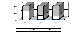 Рис. 1. Соотношение собственных и заемных средств в 2002-2004г.г. Снизилась кредиторская задолженность, которая составляет наибольший удельный вес в заемных средствах – 23,2 % на конец года. Причем ее уменьшение влечет за собой улучшение платежеспособности предприятия. В то же время в 2003 году произошло сокращение доли кредиторской задолженности в итоге баланса предприятия до 27,1% и в 2004 году до 23,2%, что свидетельствует об улучшении структуры пассивов предприятия. Финансовая устойчивость - это определённое состояние счетов предприятия, гарантирующее его постоянную платежеспособность. На практике применяют разные методики анализа финансовой устойчивости. Проанализируем финансовую устойчивость предприятия с помощью абсолютных показателей. Обобщающим показателем финансовой устойчивости является излишек или недостаток источников средств для формирования запасов и затрат, который определяется в виде разницы величины источников средств и величины запасов и затрат. Общая величина запасов и затрат равна сумме строк 210 и 220 актива балан са. Для характеристики источников формирования запасов и затрат используется несколько показателей, которые отражают различные виды источников: 1. Наличие собственных оборотных средств (490-190); 2. Наличие собственных и долгосрочных заёмных источников формирования запасов и затрат или функционирующий капитал (490+590-190); 3. Общая величина основных источников формирования запасов и затрат (490+590+610-190). Рассчитанные показатели для МУП «Йошкар-Оладорстрой» приведены в табл. 6. Таблица 6 Определение типа финансового состояния предприятия