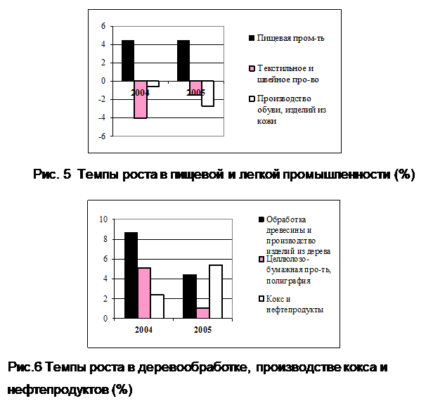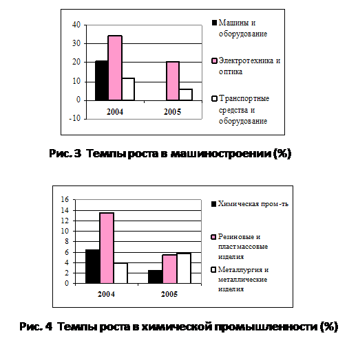 Годовые данные подтверждают тенденции в обрабатывающем секторе, которые отмечались ранее. Подавляющее большинство обрабатывающих отраслей промышленности показали заметное снижение темпов роста в 2005 году по сравнению с 2004 годом. Это особенно справедливо для отраслей, производящих торгуемые товары, которые конкурируют с иностранными производителями. Здесь устойчивая динамика наблюдается в пищевой промышленности, где сохраняются те же темпы роста, что и в 2004 г. (4,4 процента). Значительный рост наблюдался в секторе бытовой электроники, но этому почти наверняка способствовали более низкие импортные тарифы на комплектующие по сравнению с тарифами на готовую продукцию. Самое сильное замедление темпов роста было зарегистрировано в машиностроении, где темпы роста упали с более чем 20 процентов в 2004 г. до -0,1 процента в 2005 г. (см. рис. 3-6).