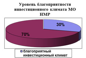 Рисунок 4 – Уровень благоприятности инвестиционного климата муниципального образования «Нижнекамский муниципальный район» В процессе исследования было выявлено, что многие из опрошенных экспертов считают инвестиционный климат муниципального образования «Нижнекамский муниципальный район» неблагоприятным. Об этом заявили 70% респондентов. Остальные 30% считают данное муниципальное образование вполне благоприятным для привлечения инвестиций (данные представлены на рисунке 4). Основными условиями, формирующими интерес инвесторов к муниципальному образованию «Нижнекамский муниципальный район» 60% опрошенных считают наличие в нем развитых градообразующих предприятий. А также одним из таких условий респонденты выбрали социальную и политическую стабильность (об этом говорят 30% опрошенных). И 10% опрошенных, в качестве такого условия выбрали экономическую ситуацию, сложившуюся в муниципальном образовании в настоящее время. В городе функционируют 2 градообразующих предприятия нефтехимической отрасли, что не может не отразиться на инвестиционной привлекательности муниципального образования. Помимо ОАО «Нижнекамскнефтехим» и ОАО «Нижнекамскшина», в муниципальном образовании «Нижнекамский муниципальный район», также набирает обороты ОАО «ТАНЕКО», который в настоящее время является наиболее привлекательным проектом для инвестирования и в создании которого принимают участие многие, как отечественные, так и иностранные инвесторы. А если говорить о стабильности, то уровень социальной и политической стабильности отображает уровень безопасности проживания и ведения бизнеса в муниципальном образовании. Также, респондентам был задан вопрос о том, какие отрасли наиболее привлекательны для инвесторов. На этот вопрос 30% респондентов из предложенных вариантов выбрали торговлю, 30% - сферу досуга и 40% - промышленность. Причем, на противоположный вопрос, о том, какие отрасли в первую очередь нуждаются в привлечении инвестиций, большинство опрошенных заявили, что эта отрасль – медицина (так ответили 80% респондентов). По 10% респондентов считают, что отраслями, в наибольшей степени нуждающимися в привлечении инвестиций, являются транспорт и сфера досуга. На основании анализа полученных результатов, можно заключить, что самой неблагополучной отраслью в области привлечения инвестиций является медицина. Одним из главных факторов инвестиционной привлекательности любого муниципального образования является информационное обеспечение инвестиционной политики данного муниципального образования. Но, судя по выводам, сделанным в ходе исследования, можно говорить о том, что данный фактор в муниципальном образовании «Нижнекамский муниципальный район» практически отсутствует. Об этом заявили 70% респондентов. 20% считают, что данный фактор имеет место быть лишь частично и 10% вообще затруднились ответить на поставленный вопрос. Из этого следует, что не высокая инвестиционная привлекательность муниципального образования «Нижнекамский муниципальный район» Республики Татарстан связана с недостаточной информированностью потенциальных инвесторов и отсутствием нормативно-правовых актов, основанных на принципах информационной открытости. Не получая нужный объем качественной информации об инвестиционной политике муниципального 