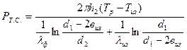 где RTi – тепловое сопротивление i -го слоя, К/Вт; PTi – тепловые потери через соответствующий элемент печи (боковую стенку, крышку и подину), определенные по формулам. Тепловые потери через боковую стенку тигля, состоящей из двух слоев (футеровка и теплоизоляция), определяется по формуле для расчета теплового потока через многослойную цилиндрическую стенку, Вт: где Тиз – допустимая температура наружной поверхности тепловой изоляции (на границе с электрической изоляцией индуктора), которую для расчета можно принять ~ 423 К; λф , λиз – теплопроводность футеровки и теплоизоляции (Вт/м·К) при средней температуре соответствующего слоя;