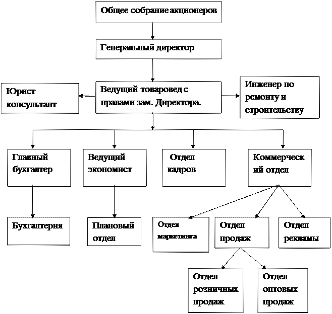 Рис.3 Организационная структура управления АО Фирмы «АСПЕК» АО Фирма "АСПЕК" включает в управленческую структуру 9 отделов: коммерческий, плановый, бухгалтерия, отдел маркетинга, отдел рекламы и отдел продаж, который в свою очередь делится на отделы розничных и оптовых продаж. А также в организационную структуру управления входят генеральный директор, ведущий товаровед (зам. директор), ведущий экономист, юрист консультант, инженер по строительству. Общему собранию участников подчиняется: Совет общества и исполнительная дирекция. В состав дирекции входят : ген.директор,глав. бухгалтер, ведущий товаровед, ведущий экономист, юрисконсульт. В состав Совета входят члены исполнительной дирекции и руководители магазинов. Совет Общества решает наиболее важные плановые задачи, заключение наиболее важных договоров поставки, заключение крупных сделок. Совет общества вправе предлагать вынесение любых вопросов на общее собрание акционеров. Оперативное руководство деятельностью общества осуществляет ген.директор , выбираемым на общем собрании участников. Генеральный директор вправе осуществлять свои действия от имени общества без доверенности. Должностные обязанности руководителей отделов: Ведущий товаровед - руководит деятельностью коммерческого отдела, отвечает за свою группу товаров. Несет ответственность перед директором. Выполняет обязанности зам. директора. Ведущий экономист - обеспечение организации комплексного экономического анализа деятельности фирмы. Осуществление руководства по экономическому планированию товарооборота, валовых доходов, издержек обращения. Анализ товарных запасов по группам товаров и составление расчетных нормативов товарных запасов. Главный бухгалтер - контроль и ведение отчетных документов по бухгалтерскому учету по всей фирме. Составление баланса. Осуществление руководства бухгалтерией. В данный момент фирма не проводит маркетинговых исследований, которые могли бы расширить возможности фирмы, помочь в планировании ее деятельности, так как фирма не располагает нужными специалистами. Поэтому важное значение для фирмы будет иметь ввод в кадровый состав специалиста по маркетингу . 5.3 Издержки обращения. Фирме необходимо обратить внимание вопросу снижения издержек обращения. Своевременно анализировать, как по сравнению с прошлым отчетным периодом изменились прочие расходы, проценты за кредит и т.д. ЗАКЛЮЧЕНИЕ. В данной работе рассмотрена деятельностьАО Фирмы "АСПЕК". Дана характеристика с точки зрения организационно -правовой формы, формы собственности, структуры. Фирма "АСПЕК" рассматривается как субъект коммерческой деятельности. В работе представлены и проанализированы издержки обращения. Изучены товароведная деятельность предприятия и его основные показатели. В данной работе мы рассмотрели целеполагание в системе управления на примере АО ФИРМЫ «АСПЕК», сформулировали миссии организации и построили организационную структуру управления по целям. Также дали предложения по совершенствованию деятельности АО Фирмы "АСПЕК". БИБЛИОГРАФИЧЕСКИЙ СПИСОК. 1. Панкратов Р.Г. "Коммерция и технология торговли", М 2000г. 2. Котлер Ф. "Основы маркетинга", М 2004г. 3. Приложение к протоколу общего собрания учредителей АО Фирмы "АСПЕК" от 21 марта 2008г. 4. Дерябин А.А. Система ценообразования и финансов, 