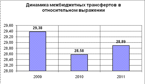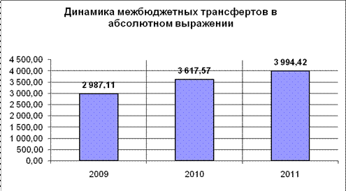 Наибольший удельный вес в классификации расходов занимают межбюджетные трансферты. В 2009 году доля расходования этих средств составляет 29,38%. Если говорить о динамике этого показателя, то уже в следующем году (2010) он снижается на 0,8%. Но в денежном эквиваленте увеличивается на 630,46 млрд. руб. В среднесрочной перспективе предусмотрено абсолютное увеличение межбюджетных трансфертов к 2011 году до 3 994,42 млрд. рублей, что составляет на 1 007,31 млрд. руб. больше по отношению к 2009 году. В диаграмме 1 и 2, можно наглядно увидеть, как происходит изменение этого показателя.