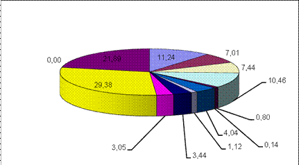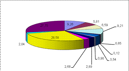 Диаграмма 5. Доля расходов Федерального Бюджета на 2011 год Следующим разделом, удельный вес которого снижается в общем объеме расходов, является образование, в 2009 году составит 4,04%. В динамике этот показатель падает, к 2011 году он снизится на 0,67%. В денежном выражении это показатель увеличивается. Это связано с реализацией национального проекта "Образование", также увеличением заработной платы учителям. Направляются ассигнования на повышение квалификации и переподготовку работников федеральных бюджетных учреждений, реализация мер социальной защиты для детей-сирот и детей, оставшихся без попечения родителей, обучающихся в этих учреждениях, ассигнования позволят обеспечить предоставление среднего профессионального образования студентам, высшего образования, а именно увеличение бюджетных мест. Здравоохранение и спорт – это один из наиболее важных показателей, т. к. от финансирования этого раздела способность населения страны участвовать во всех сферах производства. Т.е. с помощью трудовых ресурсов, осуществляются все поставленные задачи государства, малых организаций, фабрик, заводов и т.д. Прогнозируется, что в 2009 году объем расходов по данному разделу составит 349,87 млрд. руб., в 2010 году произойдет увеличение на 4,55%, а в 2011 году на 5,05%. Раздел социальная политика имеет немаловажное значение, но его финансирование занимает незначительную долю в общем объеме расходов федерального бюджета. Этот показатель сначала увеличивается, а потом уменьшается. Спрогнозировано, что в 2009 году поступлений из федерального бюджета будет на сумму 310,26 млрд. руб., к 2011 году эта сумма уменьшится на 2,38 млрд. руб. Финансирование осуществляются за счет субвенций Фонда компенсаций (раздел "Межбюджетные трансферты"). Менее финансируемые разделы федерального бюджета, удельный вес которых от 0,14-1,12% в общем объеме расходов занимают: 1. культура, кинематография и СМИ; 2. жилищно-коммунальное хозяйство; 3. охрана окружающей среды. Согласно изменениям в бюджетном законодательстве в структуре расходов в 2010 и 2011 году появится новая статья условно утвержденные расходы. То есть некий объем средств, который не распределен по разделам и статьям, что даст возможность планировать новые возникающие обязательства. В соответствии со статьей 199 БК РФ, эти расходы должны составлять в объеме не мене 2,5% общего объема расходов федерального бюджета на первый год планового периода и не менее 5% общего объема расходов федерального бюджета на второй год планового периода. Последним разделом расходов федерального бюджета является секретные статьи. Если говорить о содержание этого показателя, то это статьи, которые не оглашаются, и нет доступа к этой информации, а также средства, которые не разнесены по статьям, в связи с поправками в федеральном законе "О федеральном бюджете на 2009 год и плановый период 2010 и 2011 годов". ЗАКЛЮЧЕНИЕ Бюджет Российской Федерации является важнейшим звеном финансовой системы страны. Отражая содержание процессов производства и распределения общественного продукта и национального дохода, бюджет представляет собой экономическую форму образования и использования основного централизованного фонда денежных средств государства. Огромную роль расходы бюджетов всех уровней играют в решении социальных проблем , которые принимали наиболее радикальные 