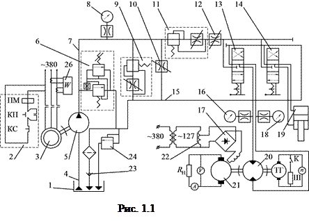 приводимый в движение асинхронным двигателем 3 марки АО 61-4 с пусковой аппаратурой 2, включающей в себя кнопки пуска КП, остановки КС и магнитный пускатель ПМ, гидромотор 20 и нагрузочную машину 21 постоянного тока ПН-100 с независимым возбуждением, работающую в генераторном режиме на постоянное нагрузочное сопротивление RН . Напряжение и ток в цепи якоря генератора измеряется амперметром А и вольтметром V. Масло из бака 1 подается в насос 5 через всасывающий трубопровод 4 и далее по магистральному напорному маслопроводу 7 через распределители 13 и 14 поступает к гидромотору 20 или гидроциллиндру 19. Из гидросистемы масло сливается по трубопроводу 15, на конце которого перед маслобаком установлен фильтр 25 для очистки масла от механических примесей и обратный клапан 23, препятствующий сливу масла из системы при неработающем насоса. Для защиты системы от перегрузки, связанной с засорением фильтра, на сливном трубопроводе 15 установлен предохранительный клапан 24. Скорость гидромотора или гидроцилиндра регулируют дросселями 10 и 12 или дроссель-регуляторами 9 и 11. Дроссель 12 и дроссель-регулятор 11 установлены на напорном трубопроводе последовательно, а дроссель 10 и дроссель-регулятор 9-параллельно. Предохранение напорного трубопровода от перегрузок и подержания постоянного давления при регулировании осуществляется с помощью переливного клапана 6. Для измерения давления масла за насосом, перед гидромотором и за гидромотором в гидросистеме установлены манометры 8,16 и 18 с демпферами, которые сглаживают пульсации давления, называемые неравномерностью подачи насоса и расхода гидромотора. Частота вращения гидромотора измеряется тахогенератором ТГ, вывод которого соединен таховольтметром n. Для увеличения диапазона измеряемых частот вращения в два раза в схеме тахогенератора и таховольтметра n установлен шунт Ш, включаемый ключом К. При включенном шунте Ш для определения действительной частоты вращения гидомотора показания прибора умножают на 2. Генератор 21 в системе опытной установки служит для создания нагрузки на гидромотор. Мощность, потребляемую из сети, N определяют по ваттметру 26. Изменение нагрузки на валу гидромотора производится посредством изменения тока возбуждения генератора 21 автотрансформатором 22 марки ЛАТР-2м, вход которого соединен с трансформатором 380/127, а выход-с обмоткой возбуждения генератора через выпрямительный мост 17. Порядок выполнения работы. Перед включением стенда в работу установить на ноль рукоятку автотрансформатора 22, полностью открыть дроссель-регулятор 11 и дроссели 12 и 10, установив их рукоятки в положение полного открытия на шкалах, закрыть дроссель-регулятор 9 (рукоятка устанавливается на ноль) и установить золотник 13 вращения гидромотора в левое положение, а золотник 14 гидроцилиндра в положение "Стоп". После пуска насоса плавно закрыть дроссель 10, установить рукоятку на ноль, а затем перейти к измерениям. В процессе измерений устанавливают различные положения рукоятки автотрансформатора 22 и при каждом положении, начиная с нулевого, измеряют напряжение и ток в цепи якоря генератора, частоту вращения гидромотора, давления, развиваемое насосом, pН , давление на входе pВХ и выходе рВЫХ из гидромотора по манометрам 16 и 18 соответственно. При изменении положения рукоятки автотрансформатора 22 необходи