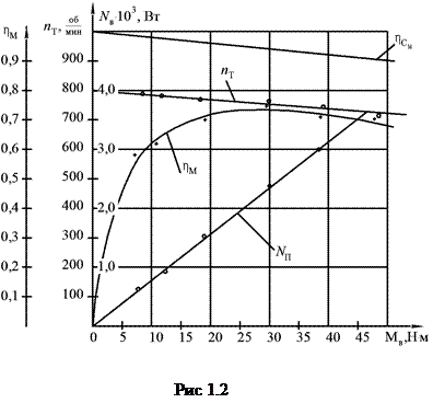 (здесь напряжение U измеряется в вольтах, ток I - в амперах, n - в оборотах в минуту). Следовательно, для каждого из значений n можно найти МВ . Однако этих данных недостаточно для построения механической характеристики, так как они не соответствуют постоянному расходу Q из-за утечек рабочей жидкости в насосе и аппаратуре управлении. Учет утечек в опытной установке производится с помощью объемного КПД насоса и гидросети: