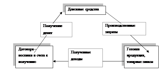 Рисунок 2.1 Операционный цикл на предприятии. Исследования показали, что наиболее весомыми последствиями невыполнения плана реализации могут быть: замедление оборачиваемости оборотных средств, снижение прибыли, что в свою очередь повлияет на значение показателя рентабельности используемого капитала. Кроме того, за этим следует штрафные санкции за невыполнение договорных обязательств перед покупателями, издержки платежей и в целом ухудшение финансового состояния предприятия [7,47с.]. Все эти аргументы говорят о необходимости осуществлении отклонений чистой выручки от запланированной суммы с целью оперативного воздействия на факторы ее формирования. Отклонения чистой выручки от запланированной суммы может быть разложено на следующие составляющие: количественные отклонения, возникшие в результате несоответствия фактического количества реализованной продукции плановому количеству; отклонения в цене, выявленные в результате сопоставления фактической и плановой учетной цены. Суммарное отклонение указанных составляющих определяет общее отклонение чистой выручки от реализации продукции и может быть представлена формулой [5,99с.]: