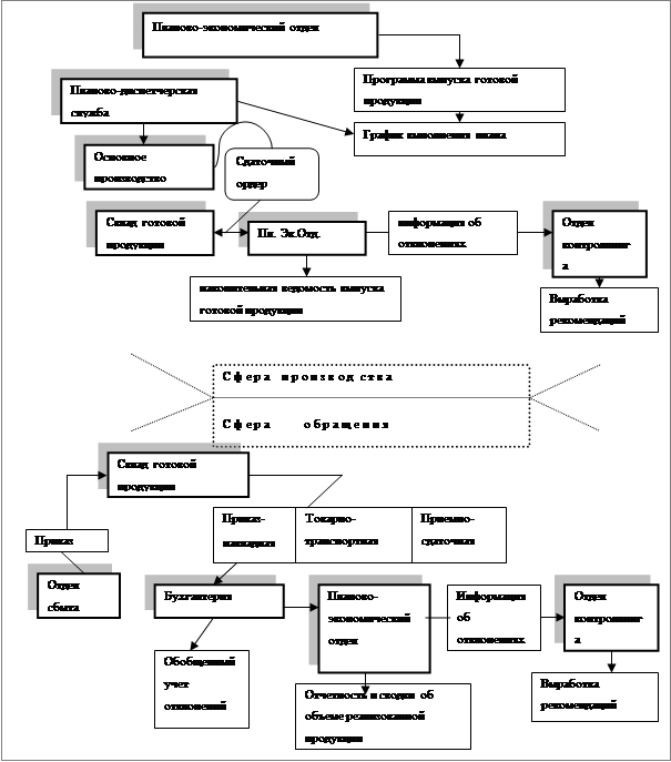 Одна из причин возникновения отклонений чистой выручки от реализации состоит в проводимой предприятием политике в области сбыта продукции. Стратегия предприятия в области сбыта заключается в том, что продукция отпускается крупным потребителям на основании заключенных с ними договоров - поставок. В соответствии с этим задачами оперативного контроллинга в области сбыта являются: контроль производства, выпуска готовой продукции и запасов на складе; контроль выполнения планов договоров поставок по объему и ассортименту продукции; контроль расчетов за реализованную продукцию; обеспечение слаженности взаимодействий структурных единиц предприятия в процессе достижения целей; сбор текущей информации (мониторинг) и определение отклонений фактических подконтрольных величин от заданных параметров, причин и ответственных за возникновение существенных отклонений, а также определение степени влияния этих отклонений на показатели рентабельности продаж и оборачиваемости активов, а в конечном итоге - на величину показателя рентабельности средств, вложенных в текущую деятельность предприятия; выработка рекомендаций по регулированию ситуации, сложившейся на предприятии, в отдельном структурном подразделении. Процедура определения отклонений фактической величины от запланированной суммы чистой выручки в подсистеме оперативного контроллинга предполагает поэтапное прохождение информации через отделы, участки и цеха предприятия [4,96с.]. Планово - экономический отдел разрабатывает программу выпуска готовой продукции с разбивкой ее на год, кварталы, месяцы и дни. Контроль над выполнением этого документа возлагается на диспетчерскую службу предприятия, а также на менеджеров структурных подразделений. В условиях непрерывного производства сдача готовой продукции из производственных цехов на склад осуществляется ежедневно. Для оперативного выявления отклонений при выпуске продукции необходимым условием является оформление этого процесса первичными документами - сдаточными ордерами. О ходе выполнения плана выпуска готовой продукции и причинах отклонений, планово - экономический отдел должен ежедневно информировать контроллинга. С целью осуществления оперативного анализа отгрузки продукции и возникших отклонений бухгалтерия ежедневно принимает со склада все первичные документы за прошедший день, на основании которых ведет оперативный учет отклонений. При этом учет отгрузки и реализации организовывается по видам продукции и в разрезе договоров и платежных документов. Последовательность работ по осуществлению процедур определения влияния отклонений чистой выручки от реализации продукции на величину алгоритма "затраты - прибыль " представлена на рисунке 2.2 [4,55с.]. Реализации выше описанных процедур контроллинга в практической деятельности промышленных предприятий Украины позволит оперативно формировать информацию о возникающих отклонениях с целью своевременного принятия управленческих решений по регулированию (перегруппировке) затрат, по реконструкции, перевооружению технических линий или отдельных узлов, по оптимизации процессов поставки сырья и материалов и др., что в целом обеспечивает совершенствование процессов производства и способствует более полному раскрытию потенциальных возможностей к