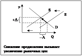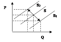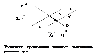 Изменение объема предложения демонстрируется движением по данной кривой предложения. Изменение предложения - сдвиг кривой предложения в ответ на изменение любого из факторов, влияющих на объем предложения, кроме цены данного товара. Важнейшими среди них являются: издержки производства, которые определяются технологией и ценами на ресурсы, налоги и дотации, цены на другие товары, ожидание изменения цен, число продавцов на рынке. Повышение предложения вызывает смещение кривой вправо, а сокращение предложения - сдвиг влево, что отражает, соответственно, увеличение и уменьшение объема предложения при всех возможных ценах. Пресечение кривых спроса и предложения определяют цену равновесия (или рыночную цену) и равновесное количество продукции.