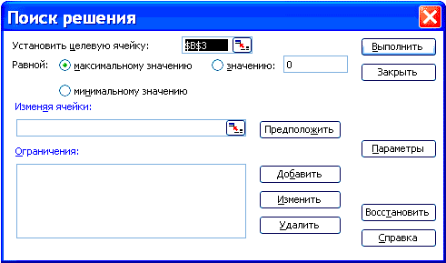 2. Выберите команду Надстройки , а затем в окне Управление выберите пункт Надстройки Excel . 3. Нажмите кнопку Перейти . 4. В окне Доступные надстройки установите флажок Поиск решения и нажмите кнопку ОК . 5. Совет Если Поиск решения отсутствует в списке поля Доступные надстройки , чтобы найти надстройку, нажмите кнопку Обзор . В случае появления сообщения о том, что надстройка для поиска решения не установлена на компьютере, нажмите кнопку Да , чтобы установить ее. После загрузки надстройки для поиска решения в группе Анализ на вкладки Данные становится доступна команда Поиск решения . Чтобы использовать надстройку Поиск решения не обязательно знать методы программирования и исследования операций, но необходимо определять, какие задачи можно решать этими методами. Пользователь должен уметь с помощью диалоговых окон надстройки Поиск решения правильно сформулировать условия задачи, и если решение существует, то “Поиск решения” отыщет его. В основе надстройки лежат итерационные методы. В том случае, когда оптимизационная задача содержит несколько переменных величин, для анализа сценария необходимо воспользоваться надстройкой Поиск решения. “Поиск решения” позволяет использовать одновременно большое количество изменяемых ячеек (до 200) и задавать ограничения для изменяемых ячеек. Общие свойства, которые характерны для задач, решаемых с помощью надстройки Поиск решения: · Существует единственная целевая ячейка, содержащая формулу, значение которой должно быть сделано максимальным, минимальным или же равным, какому-то конкретному значению. · Формула в этой целевой ячейке содержит ссылки на ряд изменяемых ячеек. Поиск решения заключается в том, чтобы подобрать такие значения переменных в изменяемых ячейках, которые бы обеспечили оптимальное значение для формулы в целевой ячейке. · Может быть задано некоторое количество ограничений — условий или соотношений, которым должны удовлетворять некоторые из изменяемых ячеек. Постановка задачи.Первым шагом при работе с командой Поиск решения является создание специализированного листа. Для этого необходимо создать целевую ячейку,в которую вводится основная формула. Кроме того, лист может включать другие значения и формулы, использующие значения целевой и переменных ячеек. Формула в целевой ячейке должна опираться в вычислениях на значения переменных ячеек. После того, как задача оптимизации будет подготовлена на листе, можно приступать к работе. 1. Выделите на листе целевую ячейку, в которую введена формула. 2. Выполните команду Сервис/Поиск решения. Открывается окно диалога Поиск решения (Рис. 1). Поскольку была выделена ячейка, в текстовом поле «Установить целевую ячейку» появится правильная ссылка на ячейку. В группе «Равной» переключатель по умолчанию устанавливается в положение «Максимальному значению».