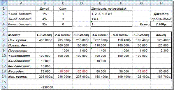 Необходимо определить девять сумм: ежемесячные суммы для 1-месячных депозитов; суммы депозитов 1 и 4 месяца для квартальных депозитов; сумму шестимесячного депозита в 1 месяце.