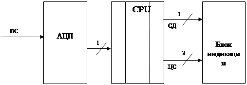 рис. 1.5.1 Структурная схема устройства на микроконтроллере со встроенным АЦП. где : ВС – входной аналоговый сигнал, СД – сигналы данных для индикации (в том числе звуковой), УС – сигналы управления индикацией 3) внешний АЦП + 3 портовый микроконтроллер без АЦП