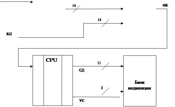 рис. 2.1 Структурная схема устройства на микроконтроллере со встроенным АЦП. где : ВС – входной аналоговый сигнал, СД – сигналы данных для индикации (в том числе звуковой), УС – сигналы управления индикацией 2.1.1 Назначение отдельных функциональных блоков Блок ЦПУ предназначен для преобразования входного аналогового сигнала в цифровое представление, сравнения этого значения с константами и в зависимости от результата сравнения осуществлять управление устройством индикации, предварительно преобразовав информацию о уровне аналогового входного сигнала в форму пригодную для блока индикации. Блок индикации предназначен для вывода информации о уровне входного аналогового сигнала, в виде десятичных чисел, с заданными количеством знакомест и частотой обновления данных. Кроме того блок индикации с помощью двух светодиодов и динамика информирует попадает ли уровень сигнала в область, ограниченную константами Кі1 и Кі2. 2.2 Описание принципа действия и общий алгоритм работы Аналоговый сигнал, поступающий на вход АЦП микроконтроллера, преобразовывается в цифровое представление. Затем микроконтроллер сравнивает уровень входного сигнала с двумя константами, хранящимися в ПЗУ, и в зависимости от результата сравнения подает сигналы на динамик и светодиоды, по линиям СД. Кроме того микроконтроллер преобразовывает информацию о уровне аналогового входного сигнала в форму пригодную для блока индикации, эта информация передается по линиям СД. Обновление информации на блоке индикации целиком зависит от МК, оно происходит с заданной частотой 44 Гц. По линиям УС, от микроконтроллера в блок индикации, передаются сигналы, предназначенные для выбора знакоместа. 2.3 Функциональная схема устройства и ее краткое описание