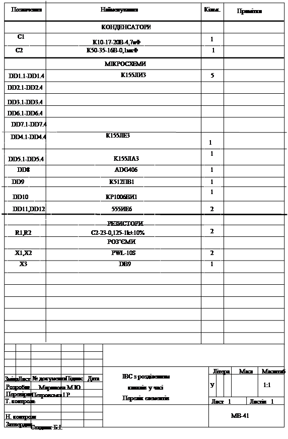 Блок-схема типової ІВС з розділенням каналів у часі Джерело 1-n - джерела вимірювальної інформації, утворені послідовним увімкненням первинних перетворювачів ПВП 1-n УП1-n; ПК - пристрій керування мультиплексором; АЦП - аналого-цифровий перетворювач; ЛЗ - лілія зв’язку; СП 1-n - споживачі. 5. Синтез принципової схеми і вибір структурної схемиНеобхідно визначити основні характеристики складових елементів (зокрема, параметри аналого-цифрового перетворювача і мультиплексора) та відповідно під’єднати їх. Вибір АЦП. Враховуючи результати виконаних розрахунків, вибираємо конкретний тип аналого-цифрового перетворювача, а саме: К512ПВ1 (розрядність 12, період перетворення не перевищує 16 мкс).