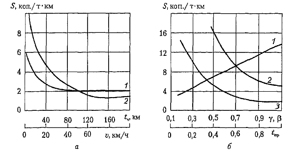 Таблица 1. Расчет себестоимости перевозок на автотранспортном предприятии. Примечание. Знак « + » — расходы, которые необходимо рассчитывать по статье; знак «-» расходы, которые не рассчитываются по статье. Логистические организации участвуют в транспортном процессе и тем самым оказывают существенное влияние на себестоимость перевозки грузов автомобильным транспортом. Знание работниками организаций влияния эксплуатационных показателей на себестоимость 1 т-км позволяет правильно использовать транспортные средства при доставке продукции потребителям и тем самым снизить себестоимость перевозок грузов. Проведенные на автомобильном транспорте исследования показали, что изменение дальности перевозки (рис. 2 а) оказывает существенное влияние на себестоимость. На небольших расстояниях она высокая, а с увеличением его она сокращается. С увеличением технической скорости и сокращением времени простоя под погрузкой и разгрузкой возрастают пробег и производительность автомобиля при неизменной сумме постоянных расходов, что позволяет снизить себестоимость перевозок, приходящихся на 1 т - км. При повышении коэффициентов использования грузоподъемности и пробега подвижного состава резко снижается себестоимость перевозок (рис. 2 б) так как при этом уменьшается сумма и переменных и постоянных расходов, приходящихся на 1 т х км.