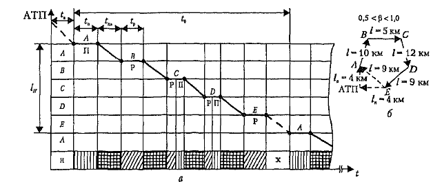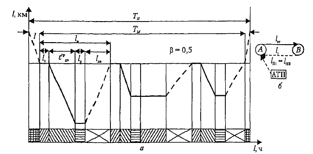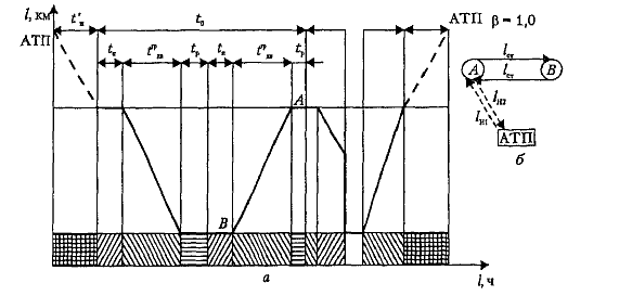 Рис. 5. График работы автомобиля на маятниковом маршруте с обратным холостым пробегом (а) и его схема (б). Технико-экономические показатели для этого маршрута рассчитываются по следующим формулам: