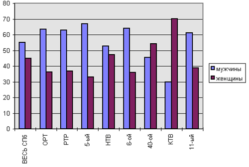 Рисунок 2.1 – Механизм подсчета рейтинга[12] Те же самые принципы применимы и при вычислении рейтинга среди индивидуумов. Если в каждом из 5 вышеупомянутых домов проживает по 2 человека, то база для расчета рейтинга составляет 10 человек. В соответствии с рис. 2.1 показатель HUT можно получить суммированием индивидуальных рейтингов всех программ: • канал А — рейтинг 40; • канал В — рейтинг 20; • канал С — рейтинг 20; • суммарный рейтинг — 80 = HUT. Еще одна важная характеристика телевизионной аудитории – это доля (Share Of Audience Rating). Так называют количество зрителей определенной программы или временного отрезка телевещания, выраженное в процентах от общего числа людей, в данный момент смотрящих телевизор. По сути, доля – это часть НUТ, рассчитанная для конкретной программы. Доля берется не от всего населения, а от телезрителей данного периода времени. Доля рассчитывается путем деления рейтинга программы на суммарный рейтинг всех программ (количество телезрителей, смотрящих данную передачу, на общую численность всех телезрителей, смотрящих ТВ в данный момент). Share = Rating / HUT или Share = Rating / HUT х 100 %. Рейтинг описывает абсолютную величину аудитории, а доля – относительную. В сравнении с рейтингом, доля более наглядно показывает распределение ТВ-аудитории между каналами в данный момент времени. Также с помощью доли можно сравнить две программы, выходящие на одном канале в различное время. Т. е. доля позволяет специалисту в области медиапланирования сравнить популярность двух программ, которые конкурируют за привлечение внимания зрителей в одно и то же время. Обычно доля и рейтинг передачи стоят в соседних колонках медиаданных. Глядя на эти показатели для конкретной передачи, легко оценить общую аудиторию телевидения в это время, просто разделив рейтинг на долю: HUT = Rating / Share или HUT = Rating / Share х 100 %. 2.2 Целевая аудитория телевидения. Среди тех, кто смотрит телевизор, не отвлекаясь на дела и не переключаясь на другие каналы, очень велико присутствие тех, кому за 55. Молодежи сравнительно мало. В группе внимательных зрителей – женщины, они чаще планируют просмотр передач, чем мужчины. Люди по-разному смотрят телевизор в разное время года, недели, дня. Обычно зимой, когда на улице холодно, а световой день короток, люди предпочитают проводить время у телевизора. Летом больше отдыхают на улице, на природе. В рабочие дни недели люди заняты своим делами и поэтому больше времени уделить телевизору могут только в субботу и воскресенье. Утром и днем люди предпочитают решать свои проблемы, планируя отдых на вечернее время. Соответственно, и активное телесмотрение проходит именно в последнюю часть суток. Чтобы выбрать на каком канале следует давать свою рекламу, необходимо сравнить их по следующим критериям: рейтинг канала вместе с ценой и временем, анализ аудитории каждого канала по:социально-профессиональному статусу, полу, возрасту, загруженность канала рекламой.[13] Диаграмма 1. СОЦИАЛЬНО-ПРОФЕССИОНАЛЬНЫЙ СТАТУС (%% предпочитающих смотреть канал)