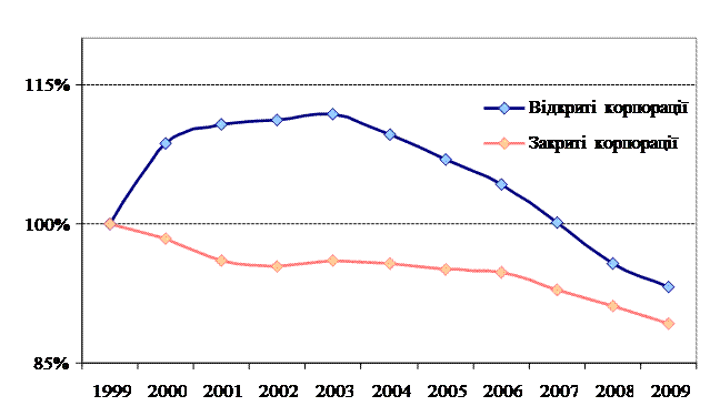 Рис. 3 . 1. Динаміка розвитку акціонерних товариств відкритого та закритого типу за період з 1999 по жовтень 2009 року, %. [ 29], [ 15] З рис. 2.1. можна сказати, що дійсно теза про те, що очікування росту кількості корпорацій відкритого типу справдилися, але ця динаміка простежується з 1998 по 2002 рік, вже з 2003 року почалось стрімке зниження їх кількості. Так з 2003 по 2006 роки було досягнуто по кількості 1998 рік, а вже 2007 та 2009 (за даними жовтня) відбулося зниження на 4,35% та 6,76% відповідно. Що стосується кількості корпорацій закритого типу, то з 1998 по 2008 рік динаміка була до зменшення, так кількість корпорацій у порівнянні до базового 1998 року, за станом на жовтень 2008р., зменшилася на 10,82%. На жовтень 2009 – ще більше. На Рис. 3.2 можна побачити це наочно у процентному співвідношенні.