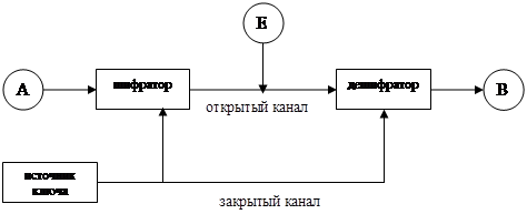 где 4. Первый этап развития криптографии Защита информации может быть двух видов: шифрование и передача по закрытому каналу. Предполагается, что сообщения передаются по так называемому “открытому” каналу связи, в принципе доступного для прослушивания некоторым другим лицам, отличным от получателя и отправителя. Будем считать, что A (Алиса) – отправитель сообщения, а В (Боб) – корреспондент (получатель) сообщения, Е (Елена) – некий враг. Классическая система секретной связи показана на рис. 1.