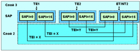 Рис. 4.3.3.9 Виртуальный интерфейс между слоями 2 и 3 Как видно из рисунка в системе могут использоваться и идентичные коды TEI, если они относятся к разным видам услуг (несовпадающими должны быть лишь комбинации SAPI-TEI). Для кодирования сигналов в ISDN используется метод 2B1Q (2 binary into 1 quaternary), что соответствует