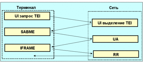 TEIс кодом в диапазоне 0-63 не нуждаются в диалоге с сетью в процессе установления связи на уровне 2. Но пользователь должен следить сам, чтобы в системе не было двух TEI с идентичными кодами. Терминалы с TEI в диапазоне 64-126 должны договариваться с сетью о TEI при установлении связи на уровне 2. Широковещательный TEI=127 служит для обращения ко всем терминалам, имеющим тот же код SAPI. Прежде чем предложить услуги уровню 3 уровень 2 должен запустить LAP. Это производится путем обмена пакетами между драйвером терминала уровня 2 и соответствующим сетевым драйвером. Предварительно должен быть активирован интерфейс уровня 1. До установления LAP возможен обмен только ненумерованными кадрами. Этот процесс включает в себя передачу команды SET asynchronous balanced mode extended(SABME), адресат при этом должен откликнуться посылкой ненумерованного отклика (UA - unnumbered acknowledgment). После установления канала уровень 2 может передавать информацию для уровня 3. Ниже (рис. 4.3.3.13) приведена последовательность обмена кадрами на уровне 2: