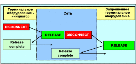 Рис. 4.3.3.19 Обмен сообщениями при разрыве связи Возможна временная пассивация терминала посредством сообщения suspend с последующим возобновлением прерванного режима с помощью сообщения resume. Каждое из этих сообщений требует подтверждения получения (suspend acknowledge и resume acknowledge, соответственно). При вызове может оказаться несколько терминалов, отвечающих запрашиваемым требованиям (например, телефонных аппаратов). Вызывающая сторона может выбрать один из них (зная, например, их положение). Существует два механизма обращения к заданному терминалу. Первый использует вспомогательную службу direct dialling-in (DDI), которая в случае реализации обычного доступа к ISDN называется multiple subscriber number (MSN). В DDI и MSN номер сети используется для целей маршрутизации в пределах локальной сети пользователя. Каждому терминалу в сети должен быть присвоен уникальный MSN-номер. Именно этот номер используется для идентификации при Setup-процедуре. Второй механизм адресации к заданному терминалу базируется на субадресации (subaddressing - SUB). В этом варианте дополнительная адресная информация передается от источника запроса к адресату. Этот адрес не является частью ISDN-номера, который используется для целей маршрутизации. Этот адрес может быть применен для обращения к некоторому процессу внутри терминала (не следует забывать, терминалом может быть ЭВМ) или к приложениям, которые не следуют стандартам OSI. Каждый терминал, подсоединенный к пассивной шине, нуждается в присвоении ему субадреса. Принципиальное различие между DDI/MSN и SUB методами адресации заключается в том, что для DDI/MSN адрес является частью ISDN номера, в то время как для SUB это не так. В этом случае каждому терминалу, подключенному к пассивной шине, должен быть присвоен такой субадрес. Процедура Setup должна содержать информацию о субадресе. Для выбора типа услуг и проверки терминальных возможностей используется обмен сообщениями alerting-connect. Для максимального удовлетворения запросов потребителей isdn должна поддерживать самые разные дополнительные виды услуг. Чтобы решить эти задачи на уровне 3 для интерфейса пользователь-сеть разработаны два протокола - функциональная и стимулирующая сигнальные процедуры. В случае стимулирующей сигнальной процедуры терминал не должен иметь какой-либо информации о вспомогательных видах услуг. Работа терминала контролируется сетью с помощью сигнальных сообщений уровня 3. Сеть и терминал работают по схеме клиент-сервер и от терминала не требуется особых аналитических способностей. Базовый формат управляющих сообщений соответствует типу information. Существуют две разновидности этого протокола: один использует управляющие последовательности символов, заключенные между * и #, для второго - сеть должна хранить специальный профайл для каждого терминала. Такой профайл может переопределять функцию некоторых клавиш терминала. Нажатие такой клавиши осуществляет вызов определенного вида услуг. В случае функциональной сигнальной процедуры терминал должен знать все о вспомогательном виде услуг и хранить всю необходимую информацию о них. Функциональный протокол использует информационные элементы facility (возможность, см. таблицу 4.3.5.4). Для пересылки этих информационных элементов используются сообщения типа register (см. описание протокола X.25). Функциональный протокол базируется на протоколе ROSE (r