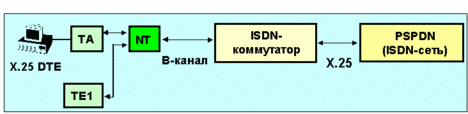 Рис. 4.3.3.21 Связи местной ISDN-АТС Взаимодействие между ISDN и PSPDN регулируется стандартом ccitt x.31 (и i.462). x.31 позволяет использовать ISDN с существующими сетями x.25. Схема взаимодействия периферийного оборудования, ISDN и PSPDN показана на рисунке 4.3.3.22 (ISDN-коммутатор может и отсутствовать).