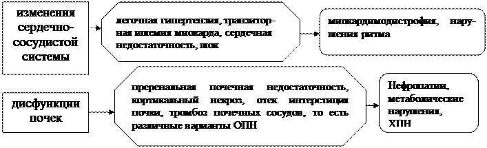 Механизмы, приводящих к острой асфиксии новорожденных1) неадекватная гемоперфузия материнской части плаценты (гипер- или гипотензионный синдром у матери любой этиологии) 2) ухудшение оксигенации крови матери (анемия, сердечно-сосудистая и дыхательная недостаточность) 3) нарушение обмена газов через плаценту (отслойка, предлежание) 4) прерывание кровотока через пуповину (узлы, сдавление, выпадение петель пуповины) 5) невозможность самостоятельного адекватного дыхания ребенка (пороки развития, поражение ЦНС, медикаментозная терапия матери и др.) ПатогенезВедущие звенья патогенеза острой асфиксии: 1. Гипоксемия приводит к накоплению недоокисленных продуктов и метаболическому ацидозу, а также включает механизмы адаптации в виде усиления «дыхательных» движений, тахикардии, выброса из костного мозга дополнительного количества эритроцитов. Реализация адаптивных процессов обеспечивается активацией симпатико-адреналовой системы, гормонами коры надпочечников и цитокинами. Снижение рО2 ниже 40 мм рт.ст. включает так называемый «ишемический рефлекс», приводящий к централизации кровообращения, т.е. ишемии кожи, легких, почек, печени, ЖКТ ради обеспечения функции жизненно важных органов: сердца, диафрагмы, мозга, надпочечников. 2. Сохранение феталъного состояния легких , высокое сопротивление сосудов малого круга является причиной шунтирования крови (справа налево), дыхательной недостаточности и перегрузки правых отделов сердца давлением, а левых отделов — объемом, то есть способствует развитию сердечной недостаточности, усилению дыхательной и циркуляторной гипоксии. 3. Изменения системной гемодинамики соответствуют клинике 1-й фазы гиповолемического шока . Отрицательным последствием централизации кровообращения являются: накопление недоокисленных продуктов, СО2 , ацидоз в ишемизированных тканях, что имеет целый ряд тяжелых последствий: для системной гемодинамики, микроциркуляции, гемореологии, водно-электролитного баланса, обменных процессов. Адаптивная активация анаэробного гликолиза с накоплением лактата усиливает ацидоз. 4. Дальнейшее прогрессирование гипоксии и смешанного ацидоза вызывает раскрытие прекапиллярных сфинктеров, децентрализацию кровообращения с падением АД, что соответствует клинике 2-й фазы гиповолемического шока, то есть развивается гемодинамический коллапс, снижающий тканевую перфузию в жизненно важных органах. 5. Активация плазменных протеаз на фоне гиперкатехоламинемии, ацидоза и повреждения эндотелия, то есть активация тромбиновой, фибринолитической, кининовой и системы комплемента, что ведет к эндотоксикозу продуктами протеолиза и вместе с ацидозом — к повреждению мембран клеток, митохондрий, лизосом, рибосом, гематоэнцефалического барьера, повышению сосудистой проницаемости, падению сосудистого тонуса, деструкции клеток (в том числе и эритроцитов), отеку интерстициального пространства, сладж-феномену, запуску внутрисосудистого свертывания, тромбозу, блокаде микроциркуляции, дистрофическим процессам. Важное место в патогенезе интранатальной асфиксии, а особенно повреждения ЦНС отводят активации продукции оксида азота эндотелием. В высоких концентрациях он оказывает токсическое действие на нейроны, а также вызывает неуправляемую вазодилятацию мозговых сосудов, нарушая проц