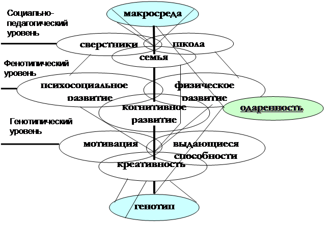 Рис.2 Соотношения и взаимосвязи внешних и внутренних факторов одаренности. Важной особенностью современного понимания одаренности, является её динамичность, которая постоянно развивается. Одаренная личность характеризуется тем, что в основе ее творческой деятельности, вне зависимости от предметной ориентации (научная, художественная, коммуникативная, спортивная и др.), лежат мотивы, интересы, потребности, непосредственно связанные с содержанием деятельности. При этом они занимают доминирующее положение. В последнее время многие исследователи склоняются к точке зрения, что ключевой характеристикой личностного потенциала (одаренности) являются не интеллект или креативность и даже не их особое сочетание, а мотивация. Это означает, что развитие одаренности во многом зависит от учителя. Ряд исследований свидетельствует о том, что люди, изначально менее способные по уровню развития интеллекта и креативности, но целенаправленно решающие собственную, личностно значимую задачу, оказываются более продуктивными, чем более одаренные, но менее заинтересованные (Р. М. Грановская, Ю. С. Крижанская и др.). Равные окружности (на каждом уровне) характерны лишь для представленного на данной схеме теоретически существующего идеала. В этом смысле данная модель может быть названа идеальной. Но при построении модели одаренности конкретного ребенка (что также можно сделать на основе идеальной модели) представляющие различные сферы окружности будут, естественно, не равны. Проиллюстрировать это можно простым примером. Рассматривая одаренность на уровне фенотипа, т.е. приобретенных качеств, многие исследователи отмечали несбалансированность развития в качестве одного из основных свойств одаренных детей. Так, опережение, достигнутое в когнитивной сфере, вполне может сочетаться с близким к норме или даже заниженным физическим развитием или социальным развитием. Возможна также и обратная ситуация: в этом случае применительно к конкретному ребенку диаметр этих окружностей (эллипсов) будет различным. Влияние микросреды (социально-педагогический уровень) на различных детей также не однородно. Так, психогенетические исследования свидетельствуют о том, что на развитие разных качеств различные факторы влияют по-разному. Например, развитие интеллекта, в первую очередь, зависит не от условий школьного обучения (как это принято считать в отечественной традиции), а от внутрисемейной среды. «Креативность, - пишет П. Торренс, - это значит копать глубже, смотреть лучше, исправлять ошибки, беседовать с кошкой, нырять в глубину, проходить сквозь стены, зажигать солнце, строить замок на песке, приветствовать будущее» [22]. Гибкость представляет собой способность легко переходить от явлений одного класса к явлениям другого класса, часто далеким по содержанию. Противоположное качество называют инертностью мышления. Оригинальность - один из основных показателей креативности. Это способность выдвигать новые, неожиданные идеи, отличающиеся от широко известных, общепринятых, банальных [23]. Далее интеллект. Он рассматривается как способность к выполнению сложных мыслительных операций, таких как: анализ, синтез, классификация, категоризация и др. Принимая во внимание вышесказанное, можно сделать вывод о том, что с любым ребёнком можно работать, развивая лу