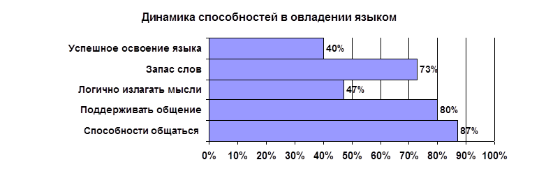 Рис.6 Динамика способностей в овладении языком. По результатам анкеты, мы построили профиль творческих качеств каждого ребёнка (Приложение) и определили уровень творческого потенциала личности на основе суммарного числа набранных баллов, (использование 5-бальной шкалы) (Приложение ). Ниже представлен один из примеров.