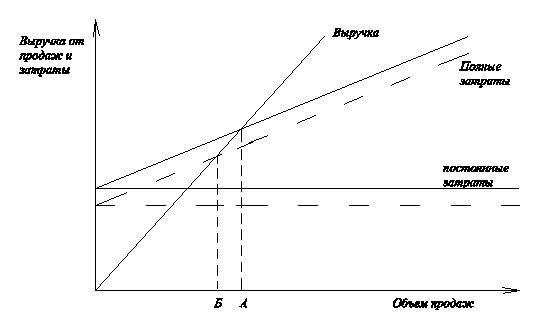 Точка А - точка безубыточности до снижения затрат Точка Б - точка безубыточности после снижения затрат Рис 1 Изменение положения точки безубыточности. Профессиональной обязанностью менеджера является правильный выбор метода работы с затратами. А. Бочкарев, аналитик и корреспондент журнала “Эксперт”, выделяет три группы техники управления затратами в зависимости от того, приносят ли они эффект в краткосрочной, среднесрочной и долгосрочной перспективе (см рис 2). Чем больше срок, тем техника сложнее[4, c44]