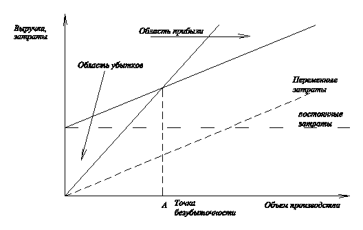 Рис.8 Определение точки безубыточности. Точка безубыточности показывает “кромку безопасности ”- она определяет, на сколько может быть сокращен объем реализации, прежде чем предприятие получит убытки. Кроме того, она позволяет спрогнозировать необходимый уровень производства продукции при изменении уровня переменных или постоянных затрат. В целом метод “директ-костинг” может быть выражен следующей формулой: