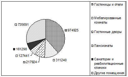 Рис. 1. Количественно-видовая структура помещений для отдыха ФРГ, шт. (2006 г). В связи с тем, что различные типы помещений не одинаковы по вместимости, соотношение количества располагаемых ими мест отличается, и здесь явно преобладают отели и гостиницы. Причем количество мест в них растет в среднем на 1% в год.