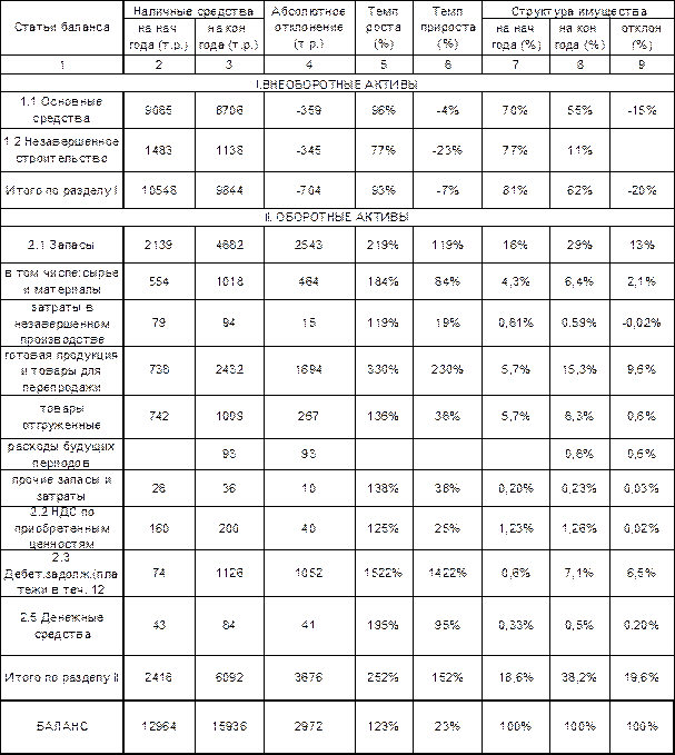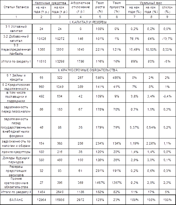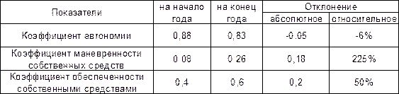 Баланс считается абсолютно ликвидным при следующем соотношении: А1>=П1, А2>=П2, А3>=П3, А4<=П4. Согласно данным таблиц 3 и 4, соотношение на начало года составляет: 43<=960, 74>=55, 2139>=0, 9065<=11510 – баланс не является абсолютно ликвидным, также как и на конец года (84<=1349, 1126>=322, 4589>=0, 8706<=13296). Для анализа исчисляют следующие коэффициенты: 1. Коэффициент текущей ликвидности (нормативное значение от 1 до 2). Ктл н.г.= Оборотные активы н.г./Краткосрочные обязательства н.г.=2416 тыс. руб./ 1454 тыс. руб. =1,67<2. Оборотные активы превышают краткосрочные обязательства в 1,67 раза. Ктл к.г.= Оборотные активы к.г./Краткосрочные обязательства к.г.= 6092 тыс. руб./ 2640 тыс. руб. = 2,3. Оборотные активы превышают краткосрочные обязательства в 2,3 раза. 2. Коэффициент промежуточного покрытия (нормативное значение 0,7-0,8). Кп н.г. = Денежные средства н.г. + КФВ н.г. + Дебиторская задолженность н.г./ Краткосрочные обязательства н.г. = 43 тыс. руб. + 74 тыс. руб./ 1454 тыс. руб. = 0,08<0,7 Денежные средства, КФВ и дебиторская задолженность покрывают 8% краткосрочных обязательств. Кп к.г. = Денежные средства к.г. + КФВ к.г. + Дебиторская задолженность к.г./ Краткосрочные обязательства к.г. = 84 тыс. руб. + 1126 тыс. руб./ 2640 тыс. руб. =0,45<0,7 Денежные средства, КФВ и дебиторская задолженность покрывают 45% краткосрочных обязательств. 3. Коэффициент абсолютной ликвидности (нормативное значение 0,1-0,2). Кп н.г. = Денежные средства н.г. + КФВ н.г./ Краткосрочные обязательства н.г. = 43 тыс. руб. / 1454 тыс. руб. = 0,029<0,1 Денежные средства и КФВ покрывают 2,9% краткосрочных обязательств. Кп к.г. = Денежные средства к.г. + КФВ к.г./ Краткосрочные обязательства к.г. = 84 тыс. руб. / 2640 тыс. руб. =0,03<0,1 Денежные средства и КФВ покрывают 3% краткосрочных обязательств. Табл. 5 Анализ показателей ликвидности ООО «Промтекс»Коэффициент абсолютной ликвидности ООО «Промтекс» увеличился на 3%, за счет увеличения высоко ликвидных активов и роста текущих обязательств, что характеризует высокую способность предприятия за счет наиболее ликвидных активов погасить свои краткосрочные обязательства. Коэффициент покрытия увеличился к концу года на 463%, что характеризует увеличение способности организации покрывать текущие обязательства за счет наиболее ликвидной части оборотных средств. Коэффициент текущей ликвидности ООО «Промтекс» к концу года вырос на 38%, что влечет улучшение платежных возможностей предприятия покрывать свои обязательства перед кредиторами за счет текущих активов. Малые организации имеют, как правило, пониженный по сравнению с крупными фирмами уровень ликвидности, это связано с тем, что в малых организациях относительно меньше денег вкладывается в запасы и дебиторскую задолженность, что подтверждается более высокими показателями оборачиваемости запасов и дебиторской задолженности, и у малых организаций относительно выше текущие обязательства. Финансовая устойчивость предприятия оценивается с помощью набора финансовых коэффициентов. Важнейшим показателем, характеризующим финансовую устойчивость предприятия, является коэффициент автономии. Минимальное пороговое значение устанавливается на уровне 0,5. Ка н. г.. = Собственный капитал н.г./ Валюта баланса н.г. = 11510 тыс. руб./ 12964 тыс. руб. = 0,88>0,5. Ка к. г.. = Собственный капитал к.г./ Валюта баланса к.г. = 13296 тыс. руб./ 15936 тыс. руб. = 0,83>0,5. Этот коэффициент важен как для инвесторов, так и для кредиторов предприятия, п