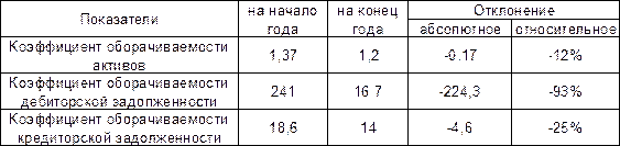 Согласно данным таблицы 7, наблюдается снижение рентабельности предприятия. Это значит, что у ООО «Промтекс» практически нет реальной возможности рассчитываться по предоставляемым кредитам, так как цена кредита значительно выше этих показателей. Финансовое положение организации, ее ликвидность и платежеспособность непосредственно зависят от того, насколько быстро средства, вложенные в активы, превращаются в реальные деньги. Показатели деловой активности: 1) Коэффициент оборачиваемости активов. Этот коэффициент характеризует эффективность использования активов с точки зрения объёма продаж. Показывает количество оборотов одного рубля активов за анализируемый период. Коб А н.г. = Выручка от продаж н.г./ Активы н.г. = 17862 тыс. руб. /12964 тыс. руб. = 1,37 Коб А к.г. = Выручка от продаж к.г./ Активы к.г. = 18767 тыс. руб. / 15936 тыс. руб. = 1,2 2) Коэффициент оборачиваемости дебиторской задолженности. Этот коэффициент показывает расширение или снижение коммерческого кредита, предоставляемого предприятием. Коб ДЗ н.г. = Выручка от продаж н.г./ Дебиторская задолженность н.г. = 17862 тыс. руб. / 74 тыс. руб. = 241 Коб А к.г. = Выручка от продаж к.г./ Дебиторская задолженность к.г. = 18767 тыс. руб. / 1126 тыс. руб. = 16,7 3) Коэффициент оборачиваемости кредиторской задолженности. Этот коэффициент показывает расширение или снижение коммерческого кредита, предоставляемого предприятию. Коб ДЗ н.г. = Выручка от продаж н.г./ Кредиторская задолженность н.г. = 17862 тыс. руб. / 960 тыс. руб. = 18,6 Коб А к.г. = Выручка от продаж к.г./ Кредиторская задолженность к.г. = 18767 тыс. руб. / 1349 тыс. руб. = 14 Табл. 6 Анализ показателей деловой активности ООО «Промтекс».
