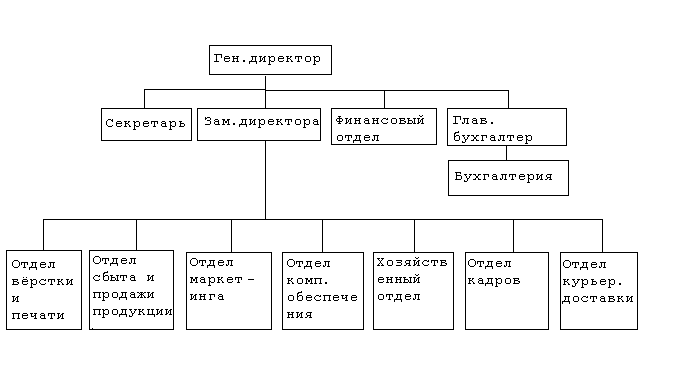 Московский Государственный Университет Экономики Статистики и Информатики Семестровая работа по дисциплине: «Теория организации и системный анализ» На тему: Системный анализ на примере ФГУП « Издательство «Бухгалтерский учёт» Выполнила студентка группы ДБМ-202 Белова О.Д. Работу проверил преподаватель: Ожегова Н.Н. Москва 2003 План: 1.Введение 1.1 Актуальность системного анализа для данной организации 1.2 Основные определения системного анализа 2. Анализ проблем 2.1 Обнаружение проблем 2.2 Точная формулировка проблемы 2.3Анализ логической структуры проблемы 2.4Анализ развития проблемы в прошлом и будущем времени 2.5Определение внешних связей с другими проблемами 2.6Выявление принципиальной разрешимости проблемы 3.Описание организации 3.1Определение аспекта рассмотрения системы 3.2Определения объекта 3.3Выделение элементов 3.4Определение подсистем 3.5Определение влияния внешней среды 3.6Иллюстрации 4.Построение дерево-целей 5.Проектирование организации для достижения целей 6.Заключение 7.Список литературы 1.Введение 1.1 Актуальность системного анализа для данной организации Цель ТО и СА изучение закономерностей, построение и формирование систем, методов их анализа применение изученных закономерностей для построения оптимальных структур организации. Основное в системном анализе это найти методы решения, для найденной проблемы, что актуально для данного предприятия. 1.2 Основные определения системного анализа Системный анализ – логически связанная совокупность теоретических и имперических знаний из области математики, естественных наук и опыта разработки сложных систем обеспечивающие повышение обоснованности решения конкретной проблемы. Система – конечное множество функциональных элементов и отношение между ними выделенное из Внешней среды с определённой целью в рамках некоторого временного интервала. Проблема – возможная цель для которой ещё не найдены пути её достижения или не представляется возможным выделить ресурсы для её решения. Цель –желаемый результат деятельности системы достижимый в пределах некоторого интервала времени Элемент – предел деления системы с точки зрения аспекта рассмотрения или решения поставленной задачи. Подсистема – это относительно независимая часть системы, выполняющая задачи в рамках общей цели системы, сохраняющая основные свойства системы, так же допускающая разложение на составные части. Компоненты – это совокупность однородных элементов системы (выборка по определённому признаку). Внешняя среда – это совокупность всех объектов изменение свойств, которых влияет на системы и/или тех объектов, чьи свойства меняются в результате изменения системы. 2.Анализ проблем 2.1 Обнаружение проблем Вот уже на протяжении нескольких лет работы Издательство «Бухгалтерский учёт» находиться на пике истощения трудовых ресурсов, персонал работающий на предприятии в большинстве своём люди в возрасте, которым трудно приспособиться к новым изменениям внешней среды. Соответственно руководство предприятием ведётся в старом ретроградном стиле. Руководство отвергает введение всех актуальных новшеств производственного процесса, работы с персоналом и с клиентами. 2.2Точная формулировка проблемы Одной из главных проблем рассматриваемого предприятия является наличие большого количества персо