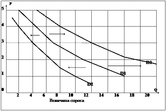 Рисунок 1. График спроса [ С.80] В обычной ситуации спрос и цена находятся в обратно пропорциональной зависимости. Закон спроса гласит, что чем выше цена, тем меньше число тех, кто согласится купить данный товар, т. е. меньше уровень спроса (при данном уровне доходов); и наоборот, чем ниже цена, тем больше будет число покупателей и количество приобретаемого товара. Таким образом, спрос и цена находятся в обратно пропорциональной зависимости. Величины спроса должны иметь определенное значение и относиться к определенному отрезку времени. Коренное свойство спроса заключается в следующем: при неизменности всех прочих параметров снижение цены ведет к соответствующему возрастанию величины спроса. Бывают случаи, когда практические данные противоречат закону спроса, но это не означает его нарушение, а только лишь нарушение допущения при прочих равных условиях. Кроме того, существование закона спроса подтверждают некоторые факты [ ]: ¨Обычно люди действительно покупают данного продукта больше по низкой цене, чем по высокой. Уже тот факт, что фирмы устраивают “ распродажи “, служит наглядным свидетельством их веры в закон спроса. Предприятия сокращают свои товарные запасы не путем повышения цен, а путем их снижения. ¨В любой данный период времени каждый покупатель продукта получает меньше удовлетворения, или выгоды, или полезности от каждой последующей единицы продукта. Поскольку потребление подвержено действию принципа убывающей предельной полезности — то есть принципа, согласно которому последующая единица данного продукта приносит все меньше и меньше удовлетворения, — потребители покупают дополнительные единицы продукта лишь при условии, что цена его снижается. ¨На несколько более высоком уровне анализа закон спроса можно объяснить эффектами дохода и замещения. Эффект дохода указывает на то, что при более низкой цене, человек может позволить себе купить больше данного продукта, не отказывая себе в приобретении каких-либо альтернативных товаров. То есть, снижение цены продукта увеличивает покупательную способность денежного дохода потребителя, а поэтому он в состоянии купить большее количество данного продукта, чем прежде. Более высокая цена приводит к противоположному результату. Эффект замещения выражается в том, что при более низкой цене у человека появляется стимул приобрести дешевый товар вместо аналогичных товаров, которые теперь относительно дороже. Потребители склонны заменять дорогие продукты более дешевыми. Эффект дохода и замещения совмещаются и приводят к тому, что у потребителя возникает способность и желание покупать большее количество продукта по более низкой цене. Цена служит самой важной детерминантой количества любого покупаемого продукта, но существуют и другие факторы, которые влияют на покупки. Они называются неценовыми детерминантами. Когда они действительно изменяются, происходит сдвиг кривой спроса. Поэтому их также называют факторами изменения спроса. Изменение одной из детерминант изменяет положение кривой спроса. Если потребители обнаруживают желание и способность покупать большее количество данного товара по каждой из возможных цен, то произошло увеличение спроса и кривая спроса сместилась вправо. Уменьшение спроса происходит тогда, когда из-за изменения в одной его детерми