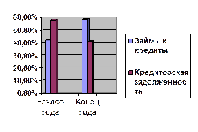 Рисунок 5 – Изменение структуры предприятия Наблюдается увеличение собственного капитала предприятия на 62281 тыс. руб. в конце года. Это связано с увеличением доли уставного капитала и уменьшением величины непокрытых убытков прошлых лет. Наибольший удельный вес принадлежит Уставному капиталу, который к концу года увеличился в 4.5 раза. 2.4 Заемный капитал предприятия Заемный капитал есть финансовые обязательства, подлежащие погашению в определённые сроки. Заёмный капитал включает в себя денежные средства или другие имущественные ценности, привлекаемые на возвратной основе для финансирования развития деятельности предприятия. Привлечение заемного капитала позволяет существенно расширить инвестиционные возможности предприятия. Формально заемный капитал представлен в пассиве баланса как совокупность долгосрочных обязательств предприятия перед третьими лицами, а его основными компонентами являются долгосрочные кредиты и займы. В основном банки выдают краткосрочные кредиты. Эти кредиты используются для финансирования текущих операций и поддержания ликвидности и платежеспособности предприятия. Долгосрочные кредиты в основном используются для финансирования затрат по капитальному строительству, реконструкции и другим капитальным вложениям, а потому они должны окупиться за счет будущей прибыли, ожидаемой к получению в результате проводимых мероприятий «капитального» характера. Долгосрочные заемные средства Наиболее выгодными для предприятия являются долгосрочные займы и кредиты, к которым в российской практике относятся обязательства со сроком погашения свыше 1 года. Долгосрочные источники являются полноценным инвестиционным ресурсом, который может быть вложен в масштабные проекты, способные окупить затраты к моменту погашения задолженности. В этом смысле долгосрочные источники приравниваются к собственному капиталу. Сумма собственного и долгосрочного заемного капиталов называется постоянным или долгосрочным капиталом. Краткосрочные заемные средства Это кредиторская задолженность, подлежащая погашению в течение 12 месяцев после отчетной даты, задолженность поставщикам и подрядчикам за поступившие материальные ценности, выполненные работы, оказанные услуги; задолженность по заработной плате, отчислениям на государственное социальное страхование, пенсионное и медицинское обеспечение; задолженность по налогам и другим платежам в бюджет; задолженность по кредитам банков. Таблица 4 - Структура краткосрочных обязательств ООО «ПТФ»