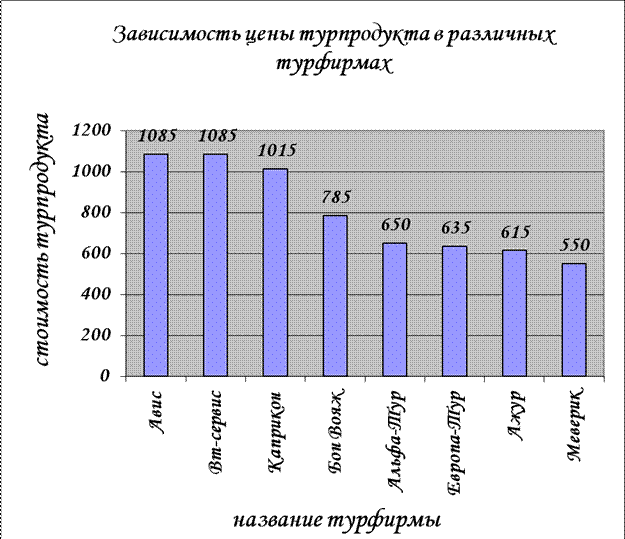 Из диаграммы, приведенной выше, можно сделать вывод, что цены на туристские путевки в различных турфирмах не одинаковы. Это связано с тем, что одни туристские фирмы являются туроператорами, а другие турагентами. Так же данные туристские фирмы предлагают различные гостиницы, как по категорийности, так и по месту их расположения и по типу питания предлагаемого в данных гостиницах. В сводных таблицах с описанием туров можно заметить, что одни фирмы включают в стоимость тура не большое количество экскурсий, другие же наоборот, привлекают клиентов не за счет цены, а за счет плотного графика интересных и познавательных программ. При покупке путевок, оператор сообщает всю эту информацию клиентам, и уже непосредственно сам клиент решает, что ему больше подходит: побольше узнать о стране и посетить множество памятников архитектуры, и соответственно заплатить за тур немного больше, или же самостоятельно организовать себе экскурсии, или же оплатить их как экскурсии носящие факультативный характер, и изначально заплатить за тур меньшую сумму. Туристские фирмы предоставляют скидку со стоимости тура, если турист, забронировавший тур, дает фирме право самостоятельного выбора своего отправления и одного из трех пунктов назначения отдыха. Широко используются сезонные скидки. Глава 4. Источники формирования дохов, туристической фирмы Прибыль на предприятии может быть получена за счет различных видов деятельности. Суммарная величина всех прибылей – балансовая прибыль предприятия. Основными элементами балансовой прибыли являются: 1. прибыль от реализации продукции, выполнения работ, оказания услуг; 2. прибыль от реализации основных фондов, а также иного имущества предприятия; 3. финансовые результаты от внереализационных операций. Как правило, основной элемент балансовой прибыли составляет прибыль от реализации продукции, выполнения работ или оказания услуг. Прибыль от реализации продукции зависит от внутренних и внешних факторов. К внутренним факторам относятся: компетентность руководства и менеджеров, конкурентоспособность продукции, уровень организации производства и труда и другое. К внешним факторам, которые не зависят от деятельности предприятия, относятся: конъюнктура рынка, уровень цен на потребляемые материально-технические ресурсы, система налогообложения и другое. Особенностью формирования цен на услуги туризма является то, что они должны включать потребительные стоимости, которые не принимают непосредственно товарную форму, например продукты общественного прошлого труда: памятники истории и архитектуры, парковые хозяйства, заповедники, или не являющимися продуктами труда, а созданы природой: водопады, горы, озера. На цену туристского продукта влияет целый ряд факторов: класс обслуживания (степень комфортности); вид туристского путешествия (по используемым транспортным средствам: авиационный, железнодорожный, автобусный); формы обслуживания (групповой или индивидуальный); конъюнктура рынка на услуги туризма; сезонный характер предоставления услуг; география размещения туристских фирм. Цена на услуги туризма включает следующие элементы: · стоимость сырья (например, продуктов для приготовления пищи); текущие расходы на производство, реализацию и организацию потребления услуг; прибыль; · косвенные налоги по