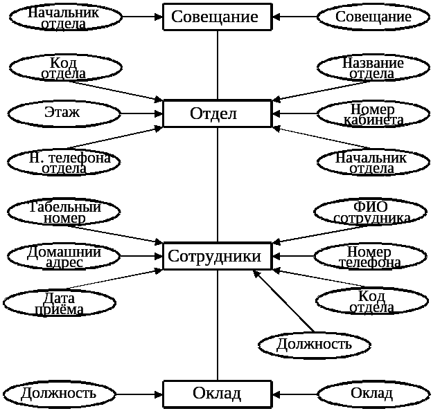 Таблица 1 – Типы данных базы данных «Отдел кадров фирмы» 5 РЕАЛИЗАЦИЯ БАЗЫ ДАННЫХ В СУБД MS Access Для реализации базы данных «Отдел кадров фирмы» в СУБД MS Access первоначально требуется создать таблицы для соответствующих отношений, полученных в ходе процедуры нормализации на предыдущем этапе проектирования базы данных. В режиме конструктора было создано четыре таблицы: совещание, отдел, сотрудники, оклад. Полям таблицы были заданы определённые форматы, что способствует контролю целостности данных. Далее в схеме данных было проведено связывание этих таблиц, схема данных представлена на рис. 2