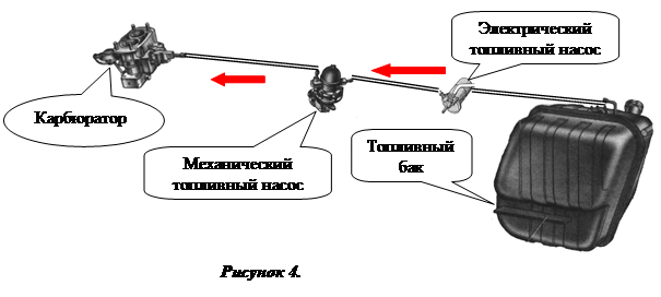 Проанализировав принципиальную схему системы подачи топлива в карбюратор большинства легковых автомобилей, изображенную на рисунке 3, я предлагаю внести в нее изменения, изображенные на рисунке 4 (красными стрелками указано направление потока топлива).