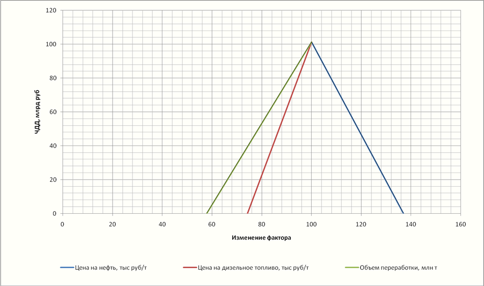 %Ч = Цена на дизельное топливо может снизиться не более, чем до 11,57 тыс.руб/т или на 28,8%, что больше 10%, следовательно проект устойчив и не чувствителен к изменению цен на дизельное топливо. 3. Анализ устойчивости и чувствительности проекта модернизации ТНПЗ к изменению объемов переработки нефти (начиная с первого года эксплуатации модернизированного НПЗ):