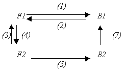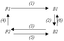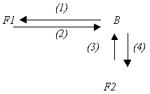Схема 2 В данном случае имеем: 1. товар, получаемый покупателем F1 от поставщика F2 , 2. счета и платежное поручение поставщика F2 своему банку B2 , 3. платежное требование и счета от банка B2 банку покупателя B1 , 4. платежное требование и счета для извещения о платеже и акцепта от банка B1 своему клиенту – предприятию F1 , 5. акцепт предприятия F1 на списание со своего счета в банке B1 суммы за товар, 6. документы о перечислении соответствующих сумм из банка B1 в банк B2 . При этом банк покупателя B2 производит списание средств со счета предприятия-покупателя F1, а банк поставщика B1 производит зачисление соответствующих сумм на счет предприятия-поставщика F2 . Недостаток приведенной схемы расчетов заключается в определенной длительности операции и возможности возникновения неплатежей из-за отсутствия средств у плательщика. Рассматривая разные финансовые инструменты, на которые предприятие направляет свое внимание, невозможно обойти стороной вексель. Достаточно часто коммерческая деятельность бывает связана с такой ситуацией, когда возникает недостаток финансовых ресурсов и необходимо прибегнуть к отсрочке платежа за проданные товары. Речь идет, таким образом, о коммерческом кредите, который предприятие - поставщик может предоставить предприятию - покупателю с получением от него долгового обязательства. В качестве средства оформления обязательства, предоставляемого в товарной форме, выступает вексель. Вексель – это составленное по установленной законом форме безусловное письменное долговое денежное обязательство или предложение уплатить определенную денежную сумму. Применительно к обещанию уплаты денежной суммы вексель называется простым. В случае предложения уплаты мы имеем переводный вексель. Простой вексель – документ, по которому заемщик (векселедатель) обещает, то есть обязуется, уплатить векселедержателю (бенефициару) или по его указанию третьему лицу определенную сумму в определенный срок. По существу простой вексель является долговой распиской. В нашей стране в основном используется форма простого векселя, в которой оплата производится теми же предприятиями, которые их выписали. Благодаря своей надежности и гибкости, за рубежом оказались более распространенными так называемые переводные векселя. Переводный вексель представляет собой письменное предложение векселедателя (кредитора, именуемого трассантом), содержащее безусловный приказ другому лицу – заемщику (именуемому трассатом), уплатить определенную сумму третьему лицу, векселедержателю (именуемому ремитентом). Переводный вексель обязательно должен быть акцептован плательщиком (трассатом), и только после этого он приобретает силу исполнительного документа. Акцепт векселя обычно отмечается в левой части лицевой стороны векселя и выражается словами “акцептован”, “принят”, “заплачу” и т.п. Заметим, что акцептант переводного векселя является главным вексельным должником и несет ответственность за оплату векселя в установленный срок. Содержание и движение переводного векселя может быть отражено, например, в виде следующей схемы, на которой используются следующие обозначения: F1 – должник (векселедатель); B – кредитор (векселеполучатель); F2 – плательщик по переводному векселю.
