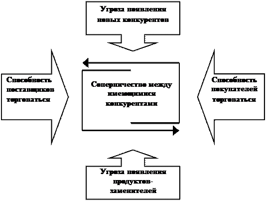 [17, c.120] Приведем краткое описание этой схемы, данное самим М. Портером: «Значение каждой из пяти сил меняется от бизнеса к бизнесу и в конечном счете предопределяет его прибыльность. В тех случаях, когда действия этих сил складываются благоприятно … многочисленные конкуренты могут получать высокие прибыли от вложенного капитала. В бизнесах, где одна или несколько сил действуют неблагоприятно… очень немногим фирмам удается долго сохранять высокие прибыли. Пять сил конкуренции определяют прибыльность бизнеса потому, что они влияют на цены, которые могут диктовать фирмы, на расходы. Которые им приходится нести, и на размеры капиталовложений, необходимые для того, чтобы конкурировать в этой отрасли» [17, 121]. Доля рынка, уровень прибыли фирмы определяются тем, насколько эффективно компания противодействует следующим конкурентным силам: · проникающим в отрасль новым конкурентам, выпускающих подобные товары; · угрозе со стороны товаров заменителей (субститутов); · компаниям-конкурентам, уже закрепившимся на отраслевом рынке; · воздействию продавцов (поставщиков); · воздействию покупателей (клиентов). 1. Новые конкуренты. Их появление в отрасли могут предупредить следующие входные барьеры: Экономия на масштабе и опыте производства уже обосновавшихся в отрасли фирм помогает удерживать издержки на таком низком уровне, который недоступен потенциальным конкурентам; Дифференциация товаров и услуг, то есть опора на торговые марки, подчеркивающие уникальность товара и признание его покупателями; Для этого необходимо: -определить факторы, формирующие представление покупателя о продукте; -изучить потребительские критерии, по которым делается выбор при покупке товара; -достаточно четко представить не просто то, кто является покупателем, а то, кто принимает решение по вопросам покупки. Дифференциация – это способность обеспечить покупателя уникальной и/или большей ценностью в виде нового качества продукта, особых потребительских свойств или послепродажного обслуживания. · Потребность в капитале. Очень часто эффективная конкуренция требует крупных первоначальных инвестиций. · Издержки переориентации, связанные с переобучением персонала, смены поставщиков, научными и проектными разработками нового продукта; · Политика государства (правительства), не способствующая проникновению на рынок, например установление высоких таможенных пошлин для иностранных конкурентов или отсутствие льготных субсидий для новичков. 2. Товары-заменители. Обострить конкуренцию может появление товаров, эффективно удовлетворяющих те же потребности, но несколько иным способом. Так, конкуренцию производителям сливочного масла могут составить предприятия, выпускающие маргарин, у которого есть свои конкурентные преимущества: это диетический продукт с низким уровнем холестерина. 3. Внутриотраслевая конкуренция и ее интенсивность. Интенсивность конкуренции может колебаться от мирного сосуществования до жестких и грубых способов выживания из отрасли. Одним из способов уменьшить давление внутриотраслевой конкуренции является использование сравнительных преимуществ, которыми обладает фирма. 4. Сила воздействия поставщиков. Фирма конкурирует, то есть ведет экономическую борьбу, не только с себе подобными производителями, но и со своими контрагент