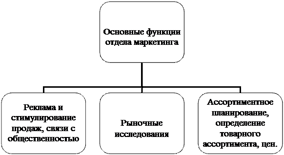 Р и с у н о к 2 – Организационная структура отдела маркетинга. Внутри отдела маркетинга выделяются следующие специализации: начальник отдела маркетинга, рядовые специалисты-маркетологи, маркетолог-аналитик. Начальник отдела маркетингаруководит работниками отдела, осуществляет разработку маркетинговой политики на предприятии на основе анализа потребительских свойств производимой продукции, обеспечивает участие отдела в составлении перспективных и текущих планов производства и реализации продукции, определении новых рынков сбыта и новых потребителей продукции. Рядовые маркетологи отслеживают цены на продаваемую продукцию, организуют разработку стратегии проведения рекламных мероприятий в средствах массовой информации с помощью наружной, световой, электронной, почтовой рекламы, рекламы на транспорте. Также проводят анализ конкурентоспособности предприятия, осуществляют поиск и анализ данных о поставщиках, потенциальных конкурентах. Маркетолог-аналитик разрабатывает и ведет базы данных о рынке (конкуренты, сегменты, товарные категории, цены, каналы),подготавливает аналитические отчеты, маркетинговые обоснования и рекомендации по внутренней и внешней информации. Основная задача торговых предприятий является обеспечить возможность покупки какого-либо товара при соответствующем качестве торгового обслуживания. Предлагаемый же набор услуг — это одно из основных средств сделать предприятие отличным от остальных. В организационной структуре отдела выделяют три основных блока функций маркетинга: 1 Реклама и стимулирование продаж, связи с общественностью; 2 Рыночные исследования; 3 Ассортиментное планирование, определение товарного ассортимента, цен.